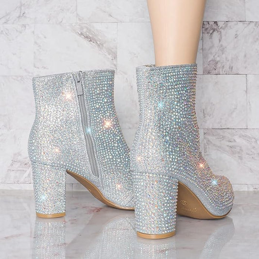 Women Rhinestone Block Chunky Heel Ankle Bootie Iceberg 12 By Forever shoes Silver 8